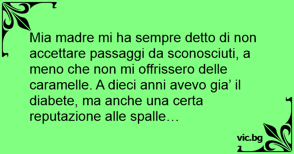 Mia madre mi ha sempre detto di non accettare passaggi da sconosciuti, a meno che non mi offrissero delle caramelle. A dieci anni avevo gia’ il diabete, ma anche una certa reputazione alle spalle…