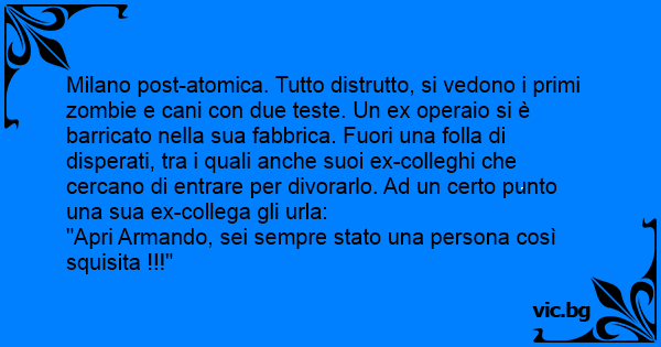 Milano post-atomica. Tutto distrutto, si vedono i primi zombie e cani соn due теsте. Un ex operaio si è barricato nella sua fabbrica. Fuori una folla di disperati, tra i quali anche suoi ex-colleghi che cercano di entrare per divorarlo. Ad un certo punto una sua ex-collega gli urla:
