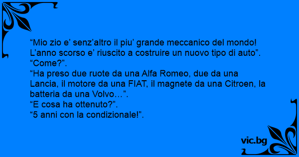 “Ha preso due ruote da una Alfa Romeo, due da una Lancia, il motore da una FIAT, il magnete da una Citroen, la batteria da una Volvo…”.