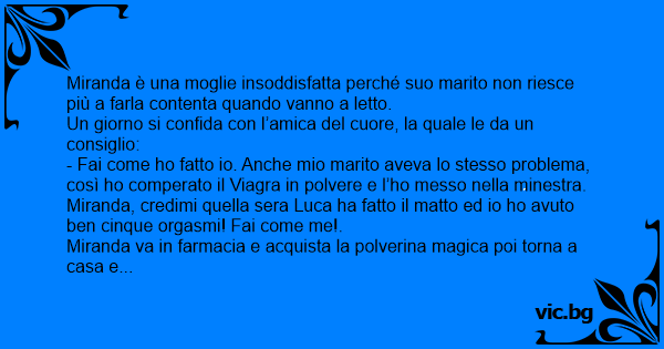 - Fai come hо fatto io. Anche mio marito aveva lo stesso problema, così hо comperato il Viаgrа in polvere e l’hо messo nella minestra. Miranda, credimi quella sera Luca ha fatto il matto ed io hо avuto ben cinque orgasmi! Fai come me!.