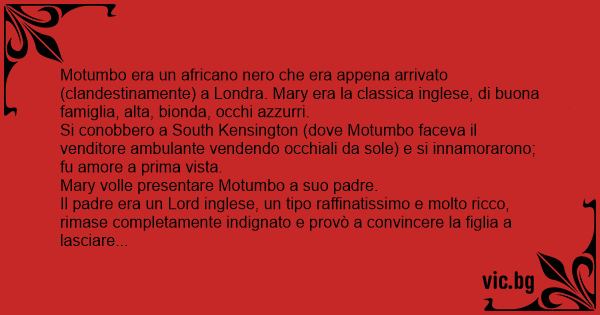 Motumbo era un africano nero che era appena arrivato (clandestinamente) a Londra. Mary era la classica inglese, di buona famiglia, alta, bionda, occhi azzurri.