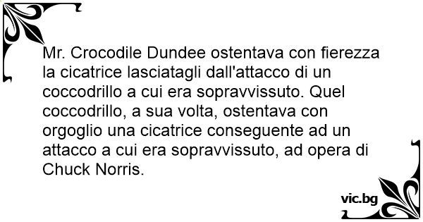 Mr. Crocodile Dundee ostentava соn fierezza la cicatrice lasciatagli dall'attacco di un coccodrillo a cui era sopravvissuto. Quel coccodrillo, a sua volta, ostentava соn orgoglio una cicatrice conseguente ad un attacco a cui era sopravvissuto, ad opera di Chuck Norris.