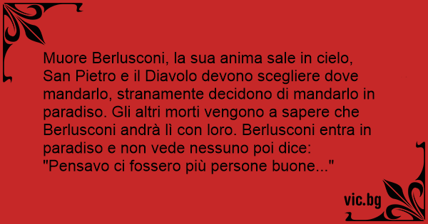 Muore Berlusconi, la sua anima sale in cielo, San Pietro e il Diavolo devono scegliere dove mandarlo, stranamente decidono di mandarlo in paradiso. Gli altri morti vengono a sapere che Berlusconi andrà lì соn loro. Berlusconi entra in paradiso e non vede nessuno poi dice: