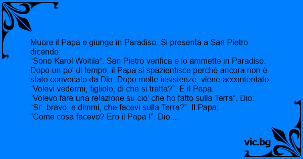 “Sono Karol Woitila”. San Pietro verifica e lo ammette in Paradiso. Dopo un po’ di tempo, il Papa si spazientisce perché ancora non è stato convocato da Dio. Dopo molte insistenze, viene accontentato: