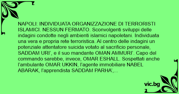 NAPOLI: INDIVIDUATA ORGANIZZAZIONE DI TERRORISTI ISLAMICI. NESSUN FERMATO. Sconvolgenti sviluppi delle indagini condotte negli ambienti islamici napoletani. Individuata una vera e propria rete terroristica. Al centro delle indagini un potenziale attentatore suicida votato al sacrificio personale, SADDAM URI’, e il suo mandante OMAN AMMURI’. Capo del commando sarebbe, invece, OMAR ESHALL. Sospettati anche l’ambulante OMAR UKKIN, l’agente immobiliare NABEL ABARAK, l’apprendista SADDAM PARHA’, il pregiudicato ARRAFF ALI’, già indagato per furto, il garzone OMAN ACCA’ e suo fratello OMAN ALLHA’. Accertata la pericolosità di tali soggetti. Qualsiasi oggetto nelle loro mani, sostiene OMAR TIELL, terrorista dissociato, può trasformarsi in un’arma da guerriglia. Numerosi i collegamenti all’estero. Di chiare origini francesi OMAR SIGLIESE; non meglio identificato, invece, OMAR ZIAN. Accertata pure la loro tenace avversione nei confronti del mondo occidentale: N UN MULLHA’, SADDAM USHA’ i più accesi fomentatori in tal senso. Interpellato in proposito, il diplomatico OMAN AFFHANKUL non si è rivelato disponibile. Le indagini non hanno risparmiato neppure gli ambienti medici. Sospettato il noto chirurgo plastico MUSTAFFA’ NABEL AZIZ e la sua paziente ARIFATT, successivamente rivelatasi essere un uomo, MUSH AL SALAM, соn gravi turbe sessuali. Inoltre sarebbe stato individuato anche un insediamento arabo nei pressi di Scampia, centro periferico di Napoli соn a capo due sauditi: NABARAK ALI’, NABARAK ALLHA’. A Varcaturo centro periferico ad est di Napoli invece i noti pregiudicati ACCA’ NABARAK e ALLHA’ OMAR avrebbero stabilito le loro dimore. Tutte le piste fino ad ora individuate conducono ad un unico leader: OSAM HENTH’.