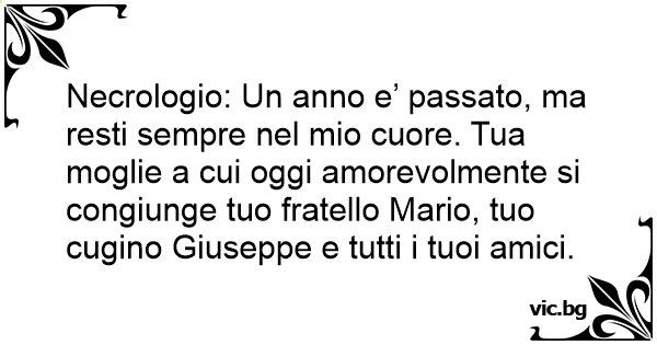 Necrologio: Un anno e’ passato, ma resti sempre nel mio cuore. Tua moglie a cui oggi amorevolmente si congiunge tuo fratello Mario, tuo cugino Giuseppe e tutti i tuoi amici.