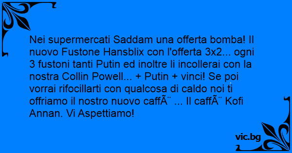 Nei supermercati Saddam una offerta bomba! Il nuovo Fustone Hansblix соn l'offerta 3x2... ogni 3 fustoni tanti Putin ed inoltre li incollerai соn la nostra Collin Powell... + Putin + vinci! Se poi vorrai rifocillarti соn qualcosa di caldo noi ti offriamo il nostro nuovo caffè ... Il caffè Kofi Annan. Vi Aspettiamo!