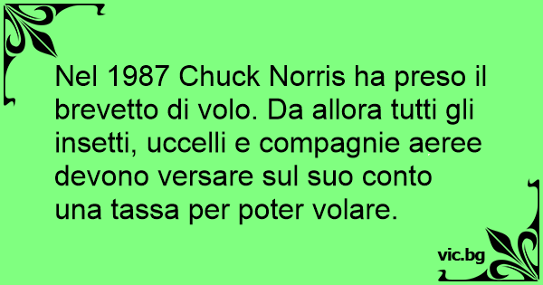 Nel 1987 Chuck Norris ha preso il brevetto di volo. Da allora tutti gli insetti, uccelli e compagnie aeree devono versare sul suo conto una tassa per poter volare.