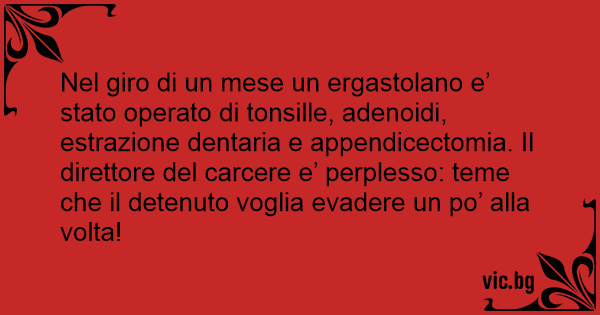 Nel giro di un mese un ergastolano e’ stato operato di tonsille, adenoidi, estrazione dentaria e appendicectomia. Il direttore del carcere e’ perplesso: teme che il detenuto voglia evadere un po’ alla volta!