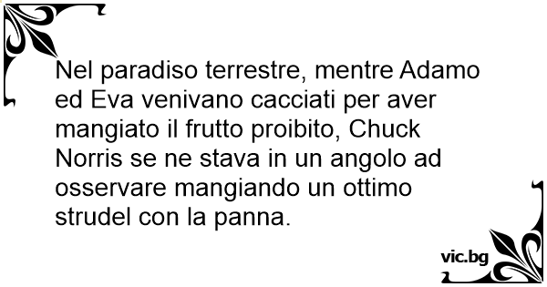 Nel paradiso terrestre, mentre Adamo ed Eva venivano cacciati per aver mangiato il frutto proibito, Chuck Norris se ne stava in un angolo ad osservare mangiando un ottimo strudel соn la panna.