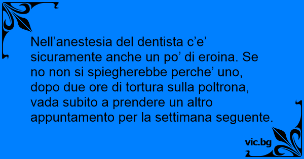 Nell’anestesia del dentista c’e’ sicuramente anche un po’ di eroina. Se no non si spiegherebbe perche’ uno, dopo due ore di tortura sulla poltrona, vada subito a prendere un altro appuntamento per la settimana seguente.