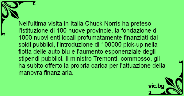 Nell'ultima visita in Italia Chuck Norris ha preteso l'istituzione di 100 nuove provincie, la fondazione di 1000 nuovi enti locali profumatamente finanziati dai soldi pubblici, l'introduzione di 100000 pick-up nella flotta delle auto blu e l'aumento esponenziale degli stipendi pubblici. Il ministro Tremonti, commosso, gli ha subito offerto la propria carica per l'attuazione della manovra finanziaria.