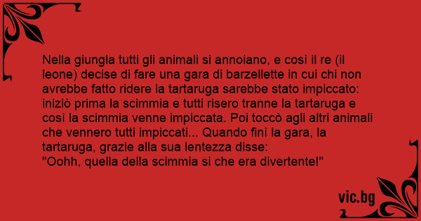 Nella giungla tutti gli animali si annoiano, e così il re (il leone) decise di fare una gara di barzellette in cui chi non avrebbe fatto ridere la tartaruga sarebbe stato impiccato: iniziò prima la scimmia e tutti risero tranne la tartaruga e così la scimmia venne impiccata. Poi toccò agli altri animali che vennero tutti impiccati... Quando finì la gara, la tartaruga, grazie alla sua lentezza disse: