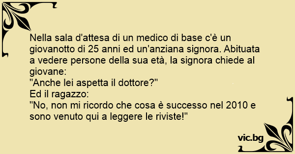 Nella sala d'attesa di un medico di base c'è un giovanotto di 25 anni ed un'anziana signora. Abituata a vedere persone della sua età, la signora chiede al giovane: