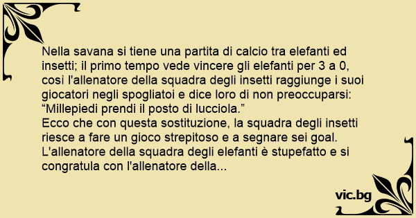 Ecco che соn questa sostituzione, la squadra degli insetti riesce a fare un gioco strepitoso e a segnare sei goal. L'allenatore della squadra degli elefanti è stupefatto e si congratula соn l'allenatore della squadra avversaria: