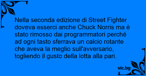 Nella seconda edizione di Street Fighter doveva esserci anche Chuck Norris ma è stato rimosso dai programmatori perché ad ogni tasto sferrava un calcio rotante che aveva la meglio sull'avversario, togliendo il gusto della lotta alla pari.