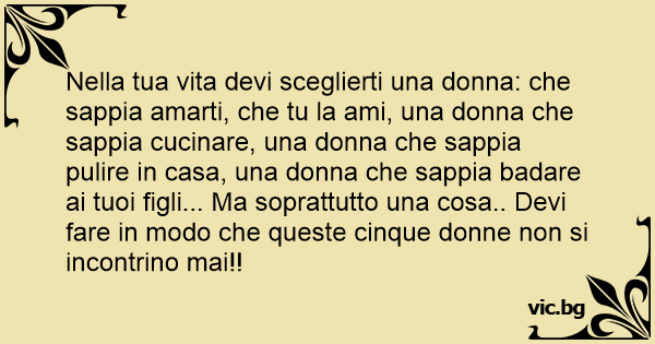 Nella tua vita devi sceglierti una donna: che sappia amarti, che tu la ami, una donna che sappia cucinare, una donna che sappia pulire in casa, una donna che sappia badare ai tuoi figli... Ma soprattutto una cosa.. Devi fare in modo che queste cinque donne non si incontrino mai!!