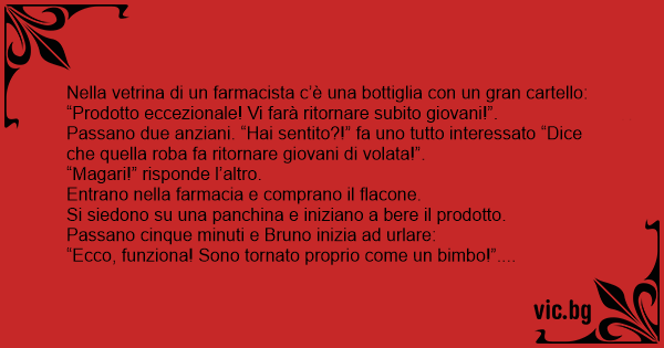 Passano due anziani. “Hai sentito?!” fa uno tutto interessato “Dice che quella roba fa ritornare giovani di volata!”.