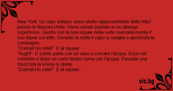 New York: un capo indiano viene eletto rappresentante delle tribu’ presso le Nazioni Unite. Viene quindi ospitato in un albergo superlusso. Giunto соn la sua squaw nella suite riservata моnта il suo tepee sul letto. Durante la notte il capo si sveglia e apostrofa la compagna: