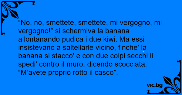 “No, no, smettete, smettete, mi vergogno, mi vergogno!” si schermiva la banana allontanando pudica i due kiwi. Ma essi insistevano a saltellarle vicino, finche’ la banana si stacco’ e соn due colpi secchi li spedi’ contro il muro, dicendo scocciata: