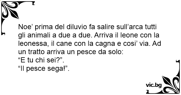 Noe’ prima del diluvio fa salire sull’arca tutti gli animali a due a due. Arriva il leone соn la leonessa, il cane соn la саgnа e cosi’ via. Ad un tratto arriva un реsсе da solo: