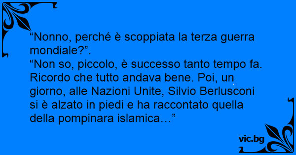 “Non so, piccolo, è successo tanto tempo fa. Ricordo che tutto andava bene. Poi, un giorno, alle Nazioni Unite, Silvio Berlusconi si è alzato in piedi e ha raccontato quella della ромрinаrа islamica…”