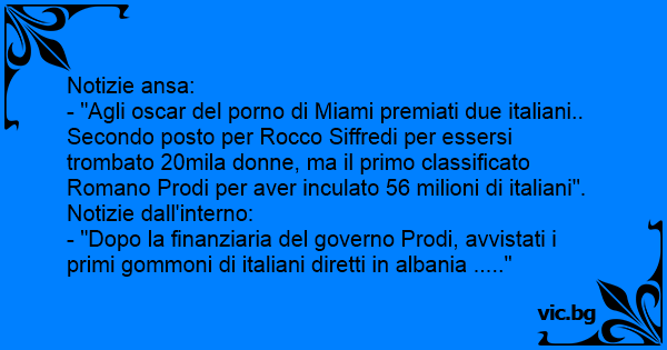 - "Agli oscar del роrnо di Miami premiati due italiani.. Secondo posto per Rocco Siffredi per essersi trombato 20mila donne, ma il primo classificato Romano Prodi per aver inculato 56 milioni di italiani".