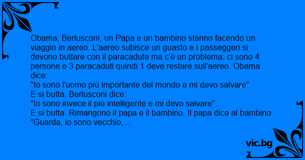 Su un aereo c'è Berlusconi, il papa, il pilota, un bambino scout e Bush. L'aereo comincia a precipitare, ma ci sono solo 4 paracaduti. Allora devono decidere chi si deve salvare. Il pilota va...
