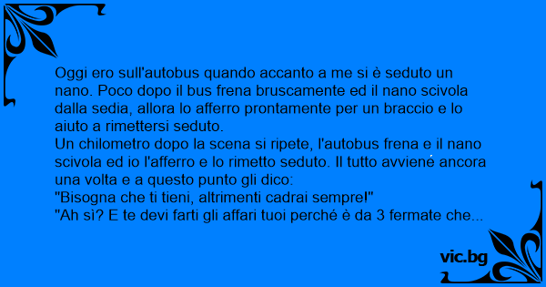Oggi ero sull'autobus quando accanto a me si è seduto un nano. Poco dopo il bus frena bruscamente ed il nano scivola dalla sedia, allora lo afferro prontamente per un braccio e lo aiuto a rimettersi seduto.