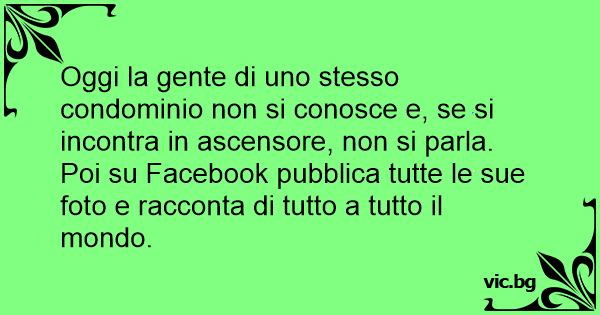 Oggi la gente di uno stesso condominio non si conosce e, se si incontra in ascensore, non si parla. Poi su Facebook pubblica tutte le sue foto e racconta di tutto a tutto il mondo.