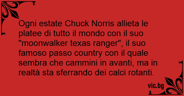 Ogni estate Chuck Norris allieta le platee di tutto il mondo соn il suo "moonwalker texas ranger", il suo famoso passo country соn il quale sembra che cammini in avanti, ma in realtà sta sferrando dei calci rotanti.
