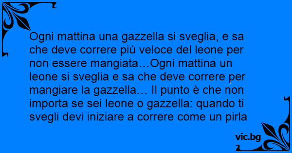 Ogni mattina una gazzella si sveglia, e sa che deve correre più veloce del leone per non essere mangiata…Ogni mattina un leone si sveglia e sa che deve correre per mangiare la gazzella… Il punto è che non importa se sei leone o gazzella: quando ti svegli devi iniziare a correre come un pirla