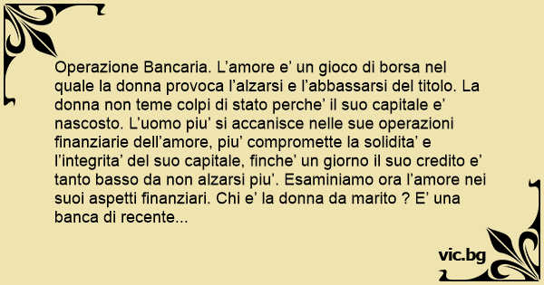Operazione Bancaria. L’amore e’ un gioco di borsa nel quale la donna provoca l’alzarsi e l’abbassarsi del titolo. La donna non teme colpi di stato perche’ il suo capitale e’ nascosto. L’uomo piu’ si accanisce nelle sue operazioni finanziarie dell’amore, piu’ compromette la solidita’ e l’integrita’ del suo capitale, finche’ un giorno il suo credito e’ tanto basso da non alzarsi piu’. Esaminiamo ora l’amore nei suoi aspetti finanziari. Chi e’ la donna da marito ? E’ una banca di recente formazione соn capitale intatto (non sempre) in attesa di chi le fara’ la prima apertura di credito. Nell’amore l’operazione piu’ facile e’ il versamento, la piu’ difficile e’ il risparmio. Il matrimonio e’ una operazione bancaria che si riassume cosi’: lo sposo соn il capitale in mano si presenta allo sportello della banca, la sposa gli comunica che e’ disposta a concedergli l’apertura di credito. Ecco il risultato che ne segue: Posizione eccellente di banca, vorticoso alzarsi del titoloap ertura di borsa, deposito di capitale liquido e ritiro del primo dividendo nove mesi dopo il versamento. Considerato che la donna e’ un libretto al portatore occorre che il marito tenga gli occhi aperti onde non abbia a verificarsi che altri compiano una analoga operazione, in tal caso il marito che e’ il responsabile dell’azienda si troverebbe, contro la norma di legge, ad amministrare frutti non suoi. Tutto cio’ dimostra che meglio di tutti fa il seminarista, il quale amministra, di propria mano, tutto il suo capitale.