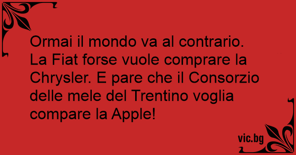 Ormai il mondo va al contrario.<br />La Fiat forse vuole comprare la Chrysler. E pare che il Consorzio delle mele del Trentino voglia compare la Apple!