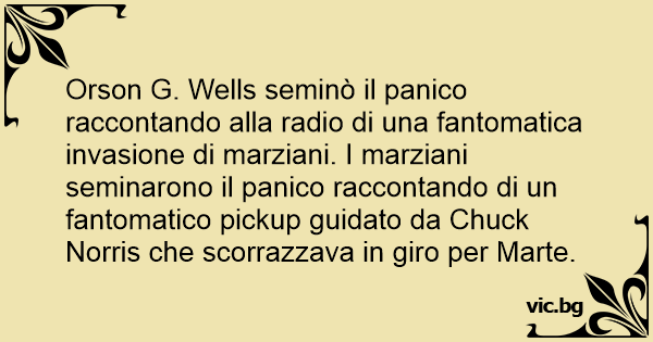 Orson G. Wells seminò il panico raccontando alla radio di una fantomatica invasione di marziani. I marziani seminarono il panico raccontando di un fantomatico pickup guidato da Chuck Norris che scorrazzava in giro per Marte.