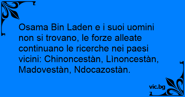 Osama Bin Laden e i suoi uomini non si trovano, le forze alleate continuano le ricerche nei paesi vicini: Chinoncestàn, Lìnoncestàn, Madovestàn, Ndocazostàn.