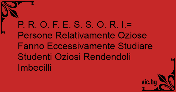 P. R. O. F. E. S. S. O. R. I.= Persone Relativamente Oziose Fanno Eccessivamente Studiare Studenti Oziosi Rendendoli Imbecilli