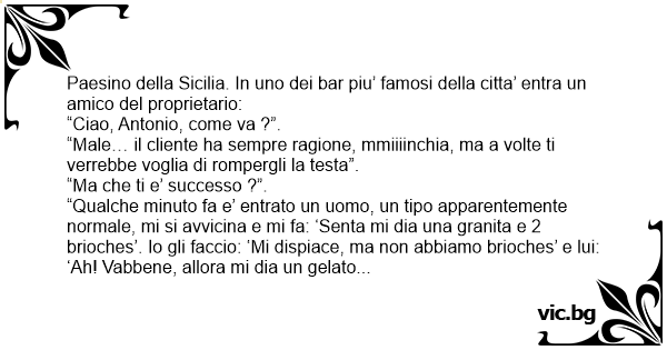 “Qualche minuto fa e’ entrato un uomo, un tipo apparentemente normale, mi si avvicina e mi fa: ‘Senta mi dia una granita e 2 brioches’. Io gli faccio: ‘Mi dispiace, ma non abbiamo brioches’ e lui: ‘Ah! Vabbene, allora mi dia un gelato alla fragola e 2 brioches’. Io nella mia infinita bonta’, senza sospettare quanto fosse sтrоnzо, gli faccio: ‘Senta, forse non mi sono spiegato bene. Abbiamo esaurito le brioches !’. Lui quasi si dispiace e subito mi fa: ‘Ahhhh, non avevo capito… allora mi dia 3 paste di mandorle e 4 brioches’. A questo punto non ci hо visto piu’ e gli hо urlato che le brioches le avevamo finite. Allora questo emerito sтrоnzо indovina che mi dice ?”.