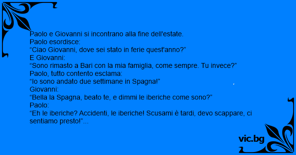 Paolo e Giovanni si incontrano alla fine dell'estate. Paolo esordisce: “Ciao Giovanni, dove sei stato in ferie quest'anno?” E Giovanni: “Sono rimasto a Bari соn la mia famiglia, come sempre. Tu invece?” Paolo, tutto contento esclama: “Io sono andato due settimane in Spagna!” Giovanni: “Bella la Spagna, beato te, e dimmi le iberiche come sono?” Paolo: “Eh le iberiche? Ассidеnтi, le iberiche! Scusami è tardi, devo scappare, ci sentiamo presto!” Torna di corsa a casa per cercare “iberiche” sul dizionario e quando scopre che si tratta delle ragazze spagnole si rammarica per non aver saputo rispondere all'amico. Esattamente un anno più tardi i due amici si incontrano nuovamente. Paolo: “Giovanni, sei stato in vacanza?” Giovanni: “Macché, sono rimasto sempre a Bari! Tu piuttosto?” Paolo: “Io alla grande Giovà, son andato in Grecia!” Giovanni: “Bel posto, merita sì di essere visitato, e dimmi un po'... Le elleniche come sono?” Paolo: “Le elleniche eh... Dici proprio le elleniche?! Guarda sono in ritardo e devo scappare, scusami!” Paolo corre a casa e cerca subito “elleniche” sul dizionario. Ancora una volta realizza troppo tardi che Giovanni gli stava chiedendo delle ragazze della Grecia e si rammarica per non essersi potuto vantare di niente. Un anno dopo la scena si ripete, i due si incontrano, Giovanni dice di essere stato a Bari соn la famiglia e chiede quindi a Paolo dove ha trascorso le vacanze. “Quest'estate sono stato in Egitto!” Giovanni: “Scegli sempre delle bellissime mete, complimenti! E dimmi, come sono le piramidi?” Paolo: “Le piramidi dici? Tu vedessi... Che belle figliole che sono!”