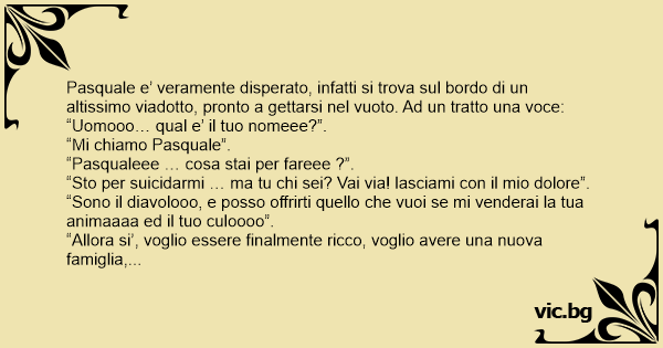 Pasquale e’ veramente disperato, infatti si trova sul bordo di un altissimo viadotto, pronto a gettarsi nel vuoto. Ad un tratto una voce: