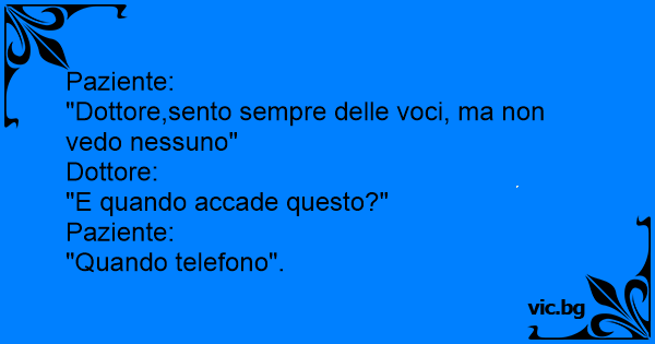 - "dottore,sento delle voci,ma non vedo nessuno" - "signora, quando le capita?" - "sempre..........quando sono al telefono!"