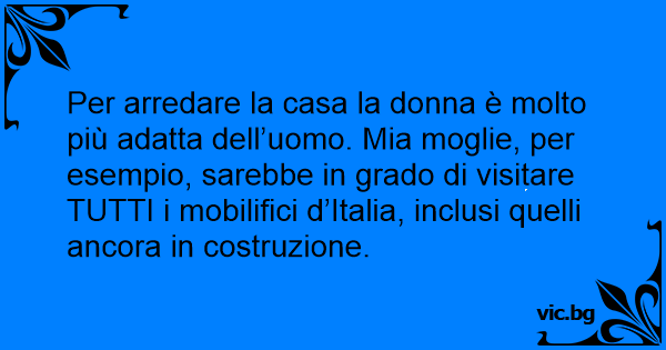 Per arredare la casa la donna è molto più adatta dell’uomo. Mia moglie, per esempio, sarebbe in grado di visitare TUTTI i mobilifici d’Italia, inclusi quelli ancora in costruzione.