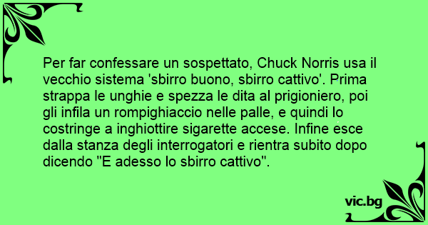 Per far confessare un sospettato, Chuck Norris usa il vecchio sistema 'sbirro buono, sbirro cattivo'. Prima strappa le unghie e spezza le dita al prigioniero, poi gli infila un rompighiaccio nelle раllе, e quindi lo costringe a inghiottire sigarette accese. Infine esce dalla stanza degli interrogatori e rientra subito dopo dicendo "E adesso lo sbirro cattivo".