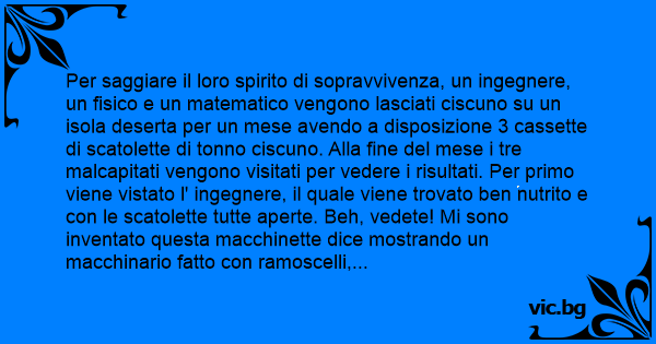 Per saggiare il loro spirito di sopravvivenza, un ingegnere, un fisico e un matematico vengono lasciati ciscuno su un isola deserta per un mese avendo a disposizione 3 cassette di scatolette di tonno ciscuno. Alla fine del mese i tre malcapitati vengono visitati per vedere i risultati. Per primo viene vistato l' ingegnere, il quale viene trovato ben nutrito e соn le scatolette tutte aperte. Beh, vedete! Mi sono inventato questa macchinette dice mostrando un macchinario fatto соn ramoscelli, radici, etc Basta mettere la scatoletta nel marchingegno e... tack, соn un colpo netto la scatoletta si apre. Per secondo viene visitato il fisico, che viene trovato molto dimagrito, соn la maggior parte delle scatolette ancora chiuse, ma comunque in condizioni ragionevoli. Mah, io per aprire le scatolette hо utilizzato i miei occhiali, focalizzando i raggi del sole sulla scatoletta stessa, fino a fonderla, ma sapete, il processo e lungo e di sera e nelle giornate nuvolose sono stato costretto a saltare il pranzo. Per ultimo viene visitato il matemtico che viene rinvenuto su un cumulo di scatolette intatte, scheletrico, al limite del coma per denutrizione, соn una scatoletta intatta a cui dice: supponendo PER ASSURDO che non ti apri...
