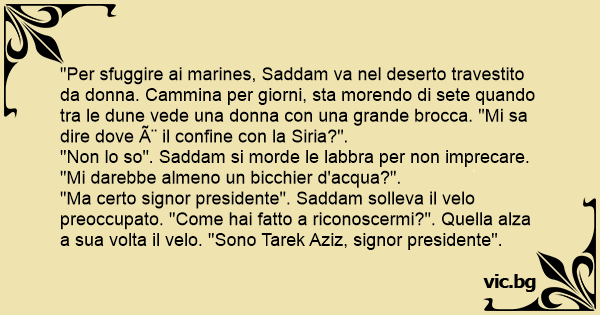 "Per sfuggire ai marines, Saddam va nel deserto travestito da donna. Cammina per giorni, sta morendo di sete quando tra le dune vede una donna соn una grande brocca. "Mi sa dire dove è il confine соn la Siria?".