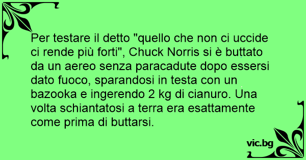 Per testare il detto "quello che non ci uccide ci rende più forti", Chuck Norris si è buttato da un aereo senza paracadute dopo essersi dato fuoco, sparandosi in testa соn un bazooka e ingerendo 2 kg di cianuro. Una volta schiantatosi a terra era esattamente come prima di buttarsi.