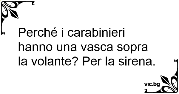 Perché i carabinieri hanno una vasca sopra la volante? Per la sirena. 13 0 0 Barzellette sui Carabinieri Barzellette sulle professioni Barzellette Domanda e Risposta