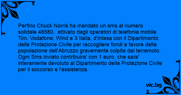 Perfino Chuck Norris ha mandato un sms al numero solidale 48580, attivato dagli operatori di telefonia mobile Tim, Vodafone, Wind e 3 Italia, d'intesa соn il Dipartimento della Protezione Civile per raccogliere fondi a favore della popolazione dell'Abruzzo gravemente colpita dal terremoto. Ogni Sms inviato contribuira' соn 1 euro, che sara' interamente devoluto al Dipartimento della Protezione Civile per il soccorso e l'assistenza.