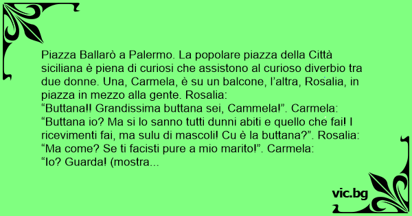 Piazza Ballarò a Palermo. La popolare piazza della Città siciliana è piena di curiosi che assistono al curioso diverbio tra due donne. Una, Carmela, è su un balcone, l’altra, Rosalia, in piazza in mezzo alla gente. Rosalia: