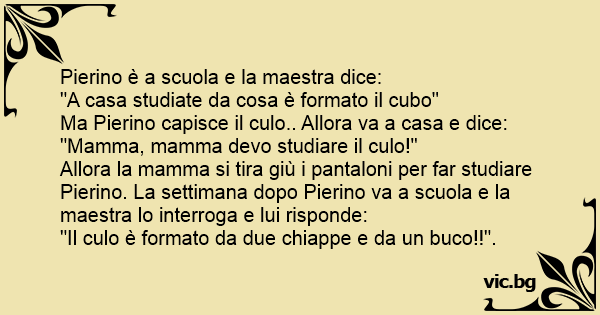 Allora la mamma si tira giù i pantaloni per far studiare Pierino. La settimana dopo Pierino va a scuola e la maestra lo interroga e lui risponde: